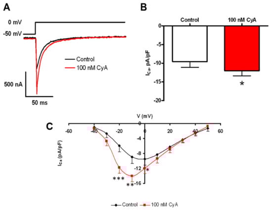 3.6. Effect of PP Inhibition by CyA on L-Type Ca2+ Current in Intact Voltage-Clamped SANC
