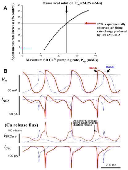 In accordance with our experimental results, the purpose of our numerical modeling was to combine the effects of ICaL and PLB phosphorylation in a biophysical detailed model to ascertain whether these effects can explain the PP firing rate change observed experimentally during PP inhibition. Because our experimental data showed that the maximum peak ICaL is increased by 100 nmol/L CyA, on average from 9.6 to 14.2 pA/pF (Figure 8), gCaL was increased in the model by 47.9% (Figure 9). Because PLB phosphorylation substantially increases (>2 fold vs. control, Figure 3), CyA surely increases Pup. This magnitude of PLB phosphorylation increase is, indeed, very large, actually close to an extreme change, and comparable to that (also ~2.5 times) reported for the maximum effect of PDE inhibition by isobutylmethylxanthine (IBMX) in rabbit SANC []. The specific changes of Pup in intact SANC that result from increases in PLB phosphorylation, however, are unknown and cannot be assessed experimentally during spontaneous AP firing. Therefore, we explored model predictions when Pup was gradually increased whereas gCaL was instantly increased, (by 47.9%, from 0.46 to 0.69 nS/pF, see above). This parameter sensitivity analysis allowed us to determine whether a numerical solution for the experimentally observed chronotropic effect of CyA to increase AP firing rate by 25% could be found with a reasonable Pup increase (i.e., within reported PLB modulatory capacity on Pup). A numerical solution for the experimental effect of CyA increasing the AP firing rate by 25% was indeed identified in response to an approximate doubling of Pup in the model from 12 to 24.25 mM/s (Figure 9A). Of note, the CyA-induced increase in gCaL alone (i.e., without a Pup increase) results only in a small change in the AP firing rate (2.8%), i.e., insufficient to account for the experimentally observed rate change of 25%.