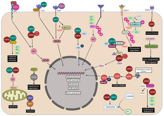 Schematic representing the recognized interactions between heat shock proteins (HSPs) and related proteins that, in response to severe acute hypoglycemia, are differentially expressed. Upward red arrows show proteins that, in T2D, were upregulated in response to hypoglycemia. HSP90 alpha (HSP90AA1, HSP90AB1, HSP90 beta, HSP90 dimer); HSPA1A, heat shock 70 kDa protein 1A; HSPA8, heat shock cognate 71 kDa protein; HSPD1, 60 kDa heat shock protein, mitochondrial; AIMP1, aminoacyl tRNA synthase complex-interacting multifunctional protein 1; CDC37, Hsp90 co-chaperone Cdc37; CLU, clusterin; DNAJB1, DnaJ homolog subfamily B member 1; MAPKAPK2, MAP kinase-activated protein kinase 2; MAPKAPK5, MAP kinase-activated protein kinase 5; PPID, peptidyl-prolyl cis-trans isomerase D; PPP3CA, serine/threonine-protein phosphatase 2B catalytic subunit alpha isoform; STIP1, stress-induced phosphoprotein 1; TLR4, toll-like receptor 4; TLR4:MD-2 complex, toll-like receptor 4 in complex with MD-2; CD274, programmed cell death 1 ligand 1; EPHA2, ephrin type-A receptor 2; E1, ubiquitin-activating enzyme; E2, ubiquitin-conjugating enzyme 2 (UBE2L3, ubiquitin-conjugating enzyme E2 L3; UBE2N, ubiquitin-conjugating enzyme E2 N); UCHL1, ubiquitin carboxyl-terminal hydrolase isozyme L1; E3, ubiquitin ligases; NFκB, nuclear factor kappa-light-chain-enhancer of activated B cells; AKT, protein kinase B, HSF, heat shock factors; SNO, S-nitrosylation; P38 MAPK, p38 mitogen-activated protein kinases; Bcl-xL, B-cell lymphoma-extra large; LRP1, low-density lipoprotein receptor-related protein 1; IR, insulin receptor; IRS1, insulin receptor substrate 1.