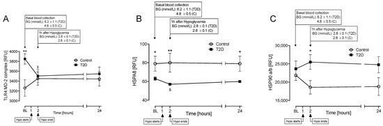 Comparison of plasma levels of the following heat shock proteins: toll-like receptor 4:myeloid differentiation factor-2 (TLR4:MD-2), heat shock protein family A (HSP70) member 8 (HSPA8), and heat shock protein 90 dimer (HSP90a/b) at baseline (BL), at hypoglycemia and 24 h post-hypoglycemia in control and T2D cohorts. Controls (white circles), T2D (black squares). TLR4:MD-2 (A), HSPA8 (B), and HSP90a/b (C). Panels (A,B) show proteins for which levels differed at BL between T2D and control cohorts. Statistics: *, p < 0.05; **, p < 0.01, control vs. T2D; $, p < 0.05, T2D BL vs. Hypo. RFU, relative fluorescent units; Hypo, hypoglycemia.