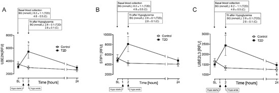 Comparison of plasma levels of the following heat shock proteins: ubiquitin-conjugating enzyme E2N (UBE2N), stress-induced phosphoprotein 1 (STIP1), and ubiquitin-conjugating enzyme E2L3 (UBE2L3) at baseline (BL), at hypoglycemia, and 24 h post hypoglycemia in control and T2D cohorts. Controls (white circles), T2D (black squares). UBE2N (A), STIP1 (B), and UBE2L3 (C), proteins for which levels differed from baseline to hypoglycemia in T2D and control cohorts. Statistics: $, p < 0.05, T2D BL vs. Hypo; &, p < 0.05, control BL vs. 24 h. RFU, relative fluorescent units; Hypo, hypoglycemia.