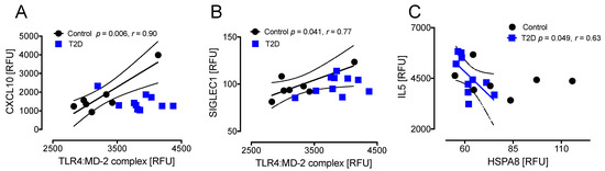 TLR4:MD-2 correlated positively with CXCL10 (r = 0.9, p < 0.006) and SIGLEC1 in controls (r = 0.77, p < 0.04) (Figure 4A,B). HSPA8 negatively correlated with IL5 in T2D (r = 0.63, p < 0.05) (Figure 4C).