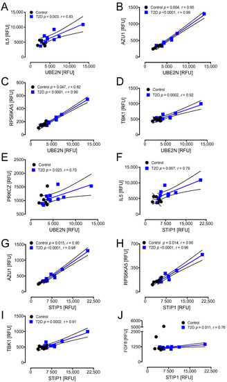 T2D: STIP1 correlated positively with IL5 (r = 0.79, p < 0.01), AZU1 (r = 0.98, p < 0.0001), RPS6KA5 (r = 0.96, p < 0.0001), TBK1 (r = 0.91, p < 0.001), and FGF8 (r = 0.76, p < 0.05) in T2D. Controls: STIP1 correlated positively with AZU1 (r = 0.90, p < 0.05) and RPS6KA5 (r = 0.90, p < 0.05) in controls (Figure 5F–J).
