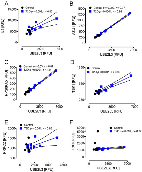 T2D: UBE2L3 correlated positively with IL5 (r = 0.80, p < 0.01), AZU1 (r = 0.98, p < 0.0001), RPS6KA5 (r = 1.0, p < 0.0001), TBK1 (r = 0.95, p < 0.0001), PRCKZ (r = 0.65, p < 0.041), and FGF8 (r = 0.77, p < 0.01) in T2D (Figure 6A–F). Controls: UBE2L3 correlated positively with AZU1 (r = 0.97, p < 0.01) and RPS6KA5 (r = 0.87, p < 0.05) in controls (Figure 6B,C).