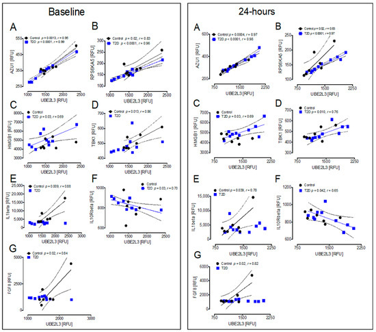Correlations at baseline and at 24 h for the 15 inflammation and 1 oxidative stress markers with UBE2L3: in T2D at 24 h, UBE2L3 correlated positively with AZU1 (r = 0.98, p < 0.0001), RPS6KA5 (r = 0.97, p < 0.0001), HMGB1 (r = 0.69, p < 0.03), and TBK1 (r = 0.76, p < 0.01), and negatively with IL10Rbeta (r = −0.65, p < 0.05) (Figure 7A–D,F). In controls at 24 h, UBE2L3 correlated positively with AZU1 (r = 0.97, p < 0.001), RPS6KA5 (r = 0.83, p < 0.05), IL1beta (r = 0.78, p < 0.05), and FGF8 (r = 0.82, p < 0.05) (Figure 7A,B,E,G). When comparing the correlations of those markers at 24 h with the correlations at baseline, the same correlations were seen for both T2D and controls for AZU1, RPS6KA5, HMGB1, IL1beta, IL10Rbeta, and FGF8 (Figure 7A–C,E–G), and only differed for TBK1, which correlated in T2D at 24 h but not at baseline, and did not correlate with controls at 24 h, despite correlating at baseline (Figure 7D).