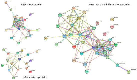 STRING interaction network showing the interactions of heat shock-related proteins. STRING 11.0 (Search Tool for the Retrieval of Interacting Genes) was used to visualize the recognized and predicted protein–protein interactions for the heat shock and inflammatory proteins reported here (https://string-db.org/ (accessed on 1 September 2021)). Network nodes represent proteins, and the lines reflect physical and/or functional interactions of proteins. Empty nodes represent the proteins of unknown three-dimensional structure, and filled nodes represent the proteins with some three-dimensional structure, either known or predicted. Different colored lines between the proteins represent the various types of interaction evidence in STRING (databases, experiments, neighborhood, gene fusion, co-occurrence, text mining, co-expression, and homology): here, known interactions are shown in light blue (from curated databases) and pink (experimentally determined); predicted interactions are shown in dark blue (gene co-occurrence); relationships gleaned from text mining (lime green), co-expression (black), and protein homology (mauve) are also shown. The heat shock proteins and the inflammatory proteins are shown separately (left) and combined (right).