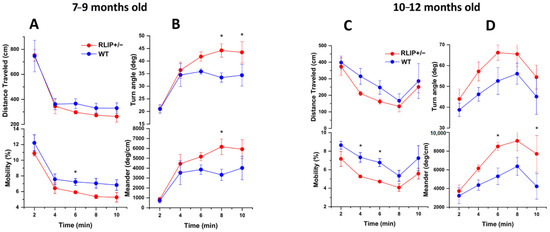 Behavioral differences between Rlip+/− and wildtype (WT) mice increase with age. (A) In a study of 5 Rlip+/− mice and 5 WT mice of 7–9 months of age, both groups exhibited habituation over the course of 10 min with reduced distance traveled (F(4,32) = 30.8; p < 0.0001) and mobility (F(2.2,17.9) = 37.35; p < 0.0001). Rlip+/− mice were less mobile than WT mice (F(1,8) = 7.4, p = 0.0260). (B) Rlip+/− mice tended to exhibit shallower turn angles in comparison to WT, which trended towards significance for both turn angle (F(1,8) = 5.2, p = 0.051), and, correcting for distance traveled, meander (F(1,8) = 4.5, p = 0.067). (C) In a study of 5 Rlip+/− mice and 5 WT mice of 10–12 months of age, both groups exhibited habituation over the course of 10 min with reduced distance traveled (F(4,32) = 7.62; p = 0.0002) and mobility (F(4,32) = 7.38; p = 0.0003). (D) Rlip+/− mice tended to exhibit a shallower turn angle compared to WT, which was more pronounced in aged mice (F(1,8) = 8.12, p = 0.022), and, correcting for distance traveled, increased meander (F(1,8) = 17.0, p = 0.0033). Significant differences (p < 0.05) at specific time points from post-hoc analysis (Fisher’s Least Significant Difference) are indicated with asterisks (*).