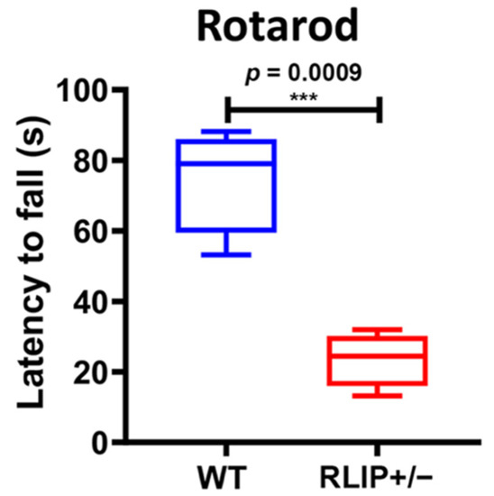 We then tested these mice in learning and memory tests. The Rotarod performance test was used to evaluate WT and Rlip+/− mouse behavioral task performance, a natural fear of falling, motor coordination and fatigue. Mice were placed on a rod that rotates at 18 RPM for up to 5 min. As shown in Figure 2, Rlip haploinsufficiency negatively affected the performance of the mice. A Student’s t-test revealed a significant drop in the performance time on the apparatus by Rlip+/− mice (mean = 23.55 s), when compared with WT cohorts (mean = 74.85 s, p = 0.0009).
