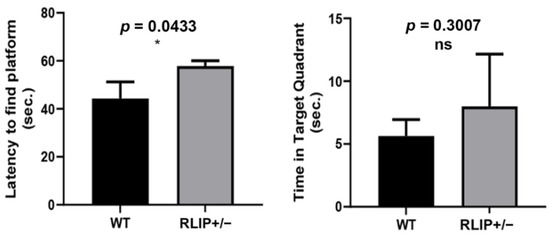 In the Morris Water Maze test, latency to find the platform was significantly increased for Rlip+/− mice (p = 0.0433) relative to age-matched WT mice (Figure 3). The time spent in the target quadrant was changed, but not significantly, for Rlip+/− mice (p = 0.3007) compared to age-matched, WT mice. These observations indicate that Rlip+/− mice showed impaired cognitive function (Figure 3).