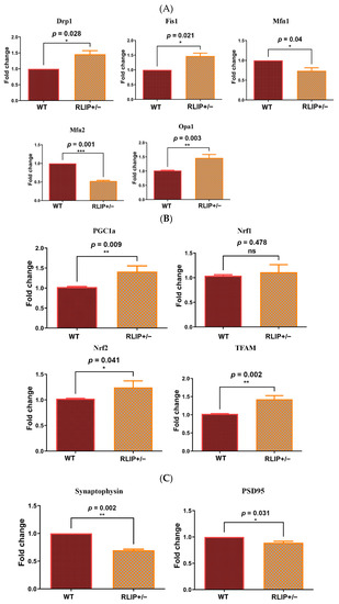 (A) Effect of Rlip deficiency on expression of genes that regulate mitochondrial dynamics. qRT-PCR was performed by previously described methods on mouse brain homogenates from five wildtype (WT) and five Rlip+/− mice. Levels of transcripts encoding mitochondrial dynamics proteins were measured in the cerebral cortex of WT and Rlip+/− animals. Gene expression levels were normalized to the beta-actin transcript and calculated as described in Materials and Methods. Asterisks denote statistically significant differences between WT and Rlip+/− groups of animals, compared using a Student’s t-test. (B). Effect of Rlip deficiency on expression of genes that regulate mitochondrial biogenesis. qRT-PCR was performed by previously described methods on mouse brain homogenates from 5 WT and 5 Rlip+/− mice. Levels of transcripts encoding mitochondrial biogenesis proteins were measured in the cerebral cortex of WT and Rlip+/− animals. (C) Effect of Rlip deficiency on expression of synaptic genes. qRT-PCR was performed by previously described methods on mouse brain homogenates from 5 WT and 5 Rlip+/− mice. Levels of transcripts encoding synaptic proteins were measured in the cerebral cortex of WT and Rlip+/− animals. * indicates p < 0.05, ** indicates p < 0.01, *** indicates p < 0.001, and ns indicates not significant.