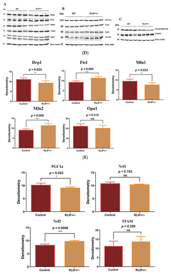 Western blot analysis was performed using protein lysates prepared from Rlip+/− and WT mice. To normalize the expression levels of mitochondrial biogenesis, mitochondrial dynamics, and synaptic proteins, we have used beta-actin as an internal control. Details of antibody dilutions are given in Table 2. After treatment, cells were lysed in 50 μL cold RIPA lysis buffer (MilliporeSigma, Burlington, MA, USA) for 60 min on ice (vortexing every 15 min) and centrifuged at 12,000× g for 11 min. After centrifugation, the supernatant was collected, and protein concentration was measured. 40 μg protein preparation in LDS buffer was loaded, electrophoretically separated by SDS-PAGE gels (10%) and transferred to a polyvinylidene difluoride (PVDF) membrane (cat# 10026933, Bio-Rad Laboratories, Hercules, CA, USA). Blocking was performed by adding 5% BSA in TBST for 60 min at room temperature on the shaker. After washing 2 times, primary antibody was added to the membranes overnight at 4 °C. The membrane was washed 3 times with TBST and incubated with HRP (horseradish peroxidase)-labeled secondary antibodies for 1 h at room temperature. Proteins were detected with chemiluminescence substrate (ECL, Thermo Fisher), and the band exposures were kept within the linear range. Bands from immunoblots were quantified using densitometry on a Kodak Scanner (ID Image Analysis Software, Kodak Digital Science, Kennesaw, GA, USA). ImageJ software version 1.46r was used to quantify band intensity and determine statistical significance.
