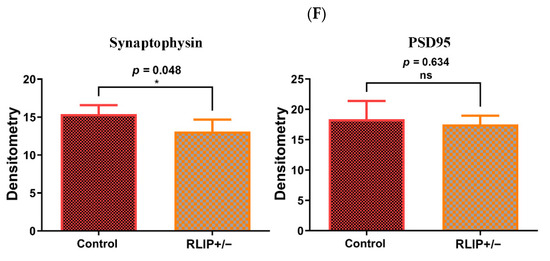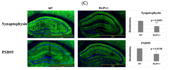 As shown in Figure 6C, synaptic proteins, including synaptophysin (p = 0.0001) and PSD95 (p = 0.0139), were significantly reduced in Rlip+/− mice, a result that is similar to the mRNA and immunoblot results and similar to previously published immunofluorescence data on the APP and tau transgenic mouse models of AD [66,67]. It is worth noting that synaptophysin immunoreactivity was reduced highly significantly.