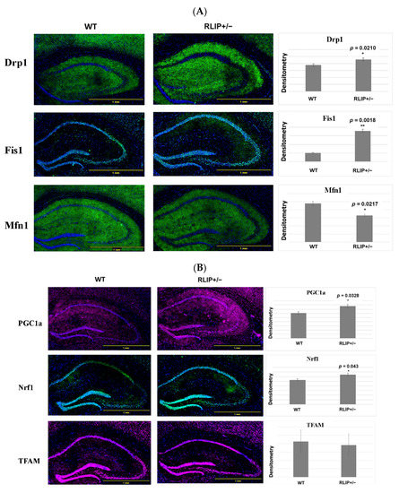 We performed immunofluorescence microscopy on mitochondrial dynamics, mitochondrial biogenesis, and synaptic proteins to understand the impact on the hippocampus in Rlip+/− mice. As shown in Figure 6A, the immunoreactivities of Drp1 (p = 0.0210) and Fis1 (p = 0.0018) were significantly increased in the Rlip+/− mice relative to WT mice. On the other hand, the mitochondrial fusion protein Mfn1 was significantly reduced in Rlip+/− mice (p = 0.0217) relative to WT mice. Aside from Drp1, which showed increases by qRT-PCR and immunofluorescence but a decrease by Western blot, our immunofluorescence data concur with qRT-PCR (mRNA levels) and immunoblotting (protein levels) data from the cerebral cortex. In the case of Drp1, it is possible that the expression changes are region-specific. Immunofluorescence signal was quantified for the hippocampus, while the Western blots and qRT-PCR were performed using protein lysates from the cerebral cotex.