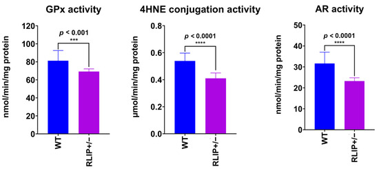 Significantly reduced rates of GSH conjugation to 4HNE were also observed in Rlip+/− mice when compared with WT mice, indicating reduced activity of glutathione transferase GSTA4, the enzyme responsible for conjugation of 4-HNE with glutathione (p < 0.0001). Finally, aldose reductase (AR) activity was significantly reduced in Rlip+/− mice compared to WT mice (p < 0.0001).