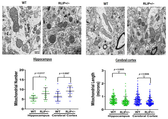 Mitochondria are the primary source of energy for neurons. Additionally, OS-associated mitochondrial dysfunction can be caused by changes in mitochondrial ultrastructure due to oxidative damage. To determine whether Rlip haploinsufficiency induces changes in mitochondrial ultrastructure, we compared mitochondrial morphology (number and length) in hippocampi and cerebral cortices from WT and Rlip+/− mice using transmission electron microscopy. Electron microscopy revealed that mitochondrial number was significantly increased in the hippocampi (p = 0.0117) and cortices (p = 0.0067) from Rlip+/− mice when compared with WT mice (Figure 8). The mitochondrial length was significantly reduced in both the hippocampi (p = 0.0005) and the cerebral cortices (p = 0.0006). Overall, the differences in mitochondrial size, morphology and number were quite striking, similar to published reports in AD cell [73,74] and mouse models [66,67]. These results are consistent with our results showing increased expression of mitochondrial fission proteins and decreased expression of mitofusins (Figure 4, Figure 5 and Figure 6). Taken together, these results suggest that Rlip+/− mice also have OS-associated mitochondrial dysfunction, adding further validation to this knockout model.
