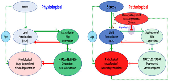 In the brains of AD patients, increased levels of free radicals and OS have been extensively reported [14,15,16,17,18,19], and this is also true of other neurodegenerative diseases [20,21,22]. It has been frequently theorized that reactive oxygen species (ROS) arise from mitochondrial dysfunction, resulting in a positive feedback loop that is thought to further damage mitochondria, cause DNA damage, and exacerbate neurodegeneration [23,24]. Chief among the detrimental ROS produced is 4-hydroxynonenal (4HNE), a toxic peroxidation product of polyunsaturated fatty acids (PUFAs) [25]. Environmental toxins, heavy metals, cigarette smoke, chronic inflammation and most other risk factors for AD have in common the ability to initiate or promote lipid peroxidation (LPO) [14,26]. Superoxide anions (O2−●, the unpaired ‘radical’ electron shown as ●) react with PUFAs to yield toxic free radicals (i.e., OH●, O2−●, etc.) and electrophilic lipid metabolites (LOO●). Given its high lipid composition, it is not surprising that LPO is highly toxic to brain tissue and is a hallmark of late-stage AD and other neurodegenerative diseases [26].