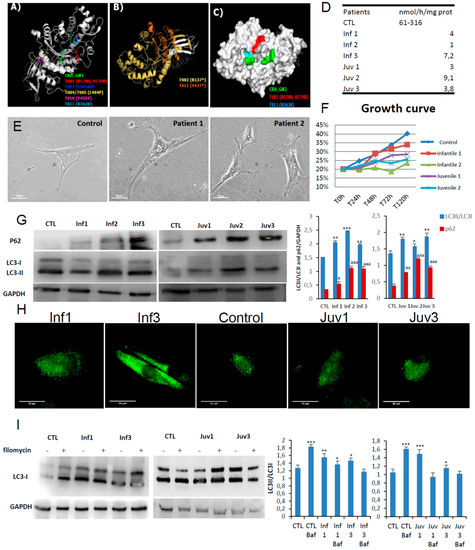 Model structures of HexA (PDB:2GJX) and HexB (PDB:1NOU) sub-unit proteins, highlighting the location of pathogenic mutations. Also shown autophagy in fibroblasts obtained in culture from patients with GM2 gangliosidosis (Tay–Sachs and Sandhoff diseases). (A). HexA point mutations: different colours depict amino acid substitutions identified in the cognate structures identified in different mutations studied. (B). Frameshift mutations in the alpha subunits found in two patients with Tay–Sachs disease are shown in yellow and orange; premature stop codons are marked by an asterisk. (C). The surface of hexosaminidase A with the critical active site region required for hydrolysis of GM2 ganglioside (CRH_GM2). The propeptide is shown in grey and the mature protein chain is depicted in white. (D). Enzymatic activity of HexA in fibroblast homogenates. (E). Morphological changes in fibroblasts from Tay–Sachs patients compared with control cells. (F). Cell growth determined in healthy and Tay–Sachs fibroblasts. (G). Expression of autophagy proteins in control and Tay–Sachs fibroblasts: LC3-I (top panels, top band), LC3-II (top panels, bottom band). (H). Immunofluorescence staining with anti-p62 antibody. (I). Impaired autophagic flux in Tay–Sachs fibroblasts. Determination of LC3-II in the presence and absence of bafilomycin A1 in control (CTL) and fibroblasts from Tay–Sachs patients; bafilomycin A1 was used at a final concentration of 100 nM with 12 h exposure. Total cellular extracts were analysed by immunoblotting with antibodies against LC3. The data are the mean ± SD for experiments conducted on two different control cell lines. Data represent the mean ± SD of three separate experiments. *** p < 0.001, ** p < 0.005, * p < 0.05 between cells from control subjects and patients with Tay–Sachs disease. a p < 0.05; aa p < 0.01; aaa p < 0.001.