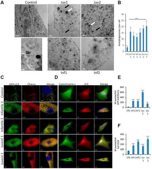 (A). Control fibroblasts and those from patients with Tay–Sachs disease showing typical ultrastructure with several distinct lamellar bodies (black arrows); white arrows indicate autophagosomes. Insets show multilamellar bodies (MLBs) and membrane-bound structures with cytoplasmic and cellular contents found in patient fibroblasts. Scale bar 10 µm (low magnification) and 2 µm (high magnification) (n = 20 cells per case). (B). Quantitative analysis of autophagosomes. (C,E). Representative image of fibroblasts after transfection of the dual-labelled mCherry-GFP-LC3 plasmid and quantification of autophagic puncta (see Methods). (D,F). Immunofluorescence of LC3 and cytochrome c in control and pathological cells and quantification of mitophagy puncta. Data represent the mean–SD of three separate experiments. *** p < 0.001, ** p < 0.005 between controls and Tay–Sachs patients.