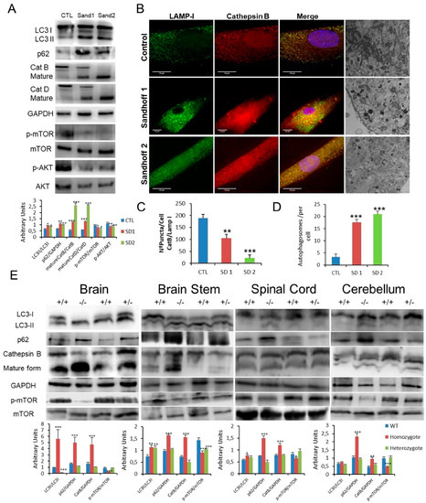 (A). Expression of LC3, p62, CatB, CatD, mTOR and AKT proteins determined in human control and Sandhoff disease fibroblasts. (B,C). Immunofluorescence of CatB in control and pathological cells with quantification in Sandhoff disease fibroblasts. (B,D). Characteristic ultrastructure with altered autophagosome abundance quantified in Sandhoff disease fibroblasts. (E). Expression of LC3, p62, CatB and mTOR proteins in the brain and spinal cord obtained from wild type and hexb −/− mutant mice with GM2 gangliosidosis (Sandhoff disease). Densitometry results are presented as means ± SEM, n = 10 mice. * p < 0.05; ** p < 0.01; *** p < 0.001 between control and diseased fibroblasts and wild type and hexB −/− mutant mice.