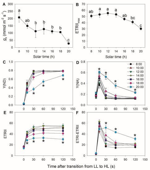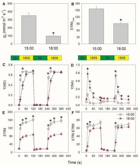 Assessment of diurnal photosynthetic performance in tomato leaves measured at 15:00 and 18:00: (A) stomatal conductance (gs); (B) maximum electron transport rate through PSII (ETRIImax); (C–F) changes in photosynthetic parameters during fluctuating light alternating between 59 and 1809 μmol photons m−2 s−1; (C) Y(ND), quantum yield of PSI non-photochemical energy dissipation due to the donor side limitation; (D) Y(NA), quantum yield of PSI non-photochemical energy dissipation due to the acceptor side limitation; (E) ETRI, electron transport rate through PSI; (F) estimated CEF performance, calculated as ETRI–ETRII. Asterisk indicates a significant difference between 15:00 and 18:00 samples. Data are shown as mean ± standard error (SE, n = 5).