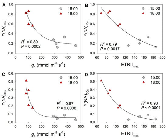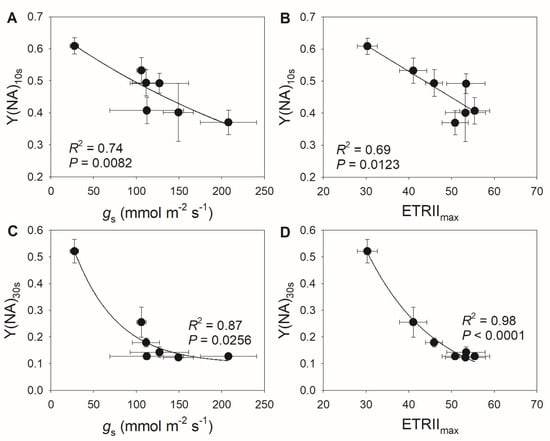 Relationships between (A) stomatal conductance (gs) and Y(NA) after transition from low to high light for 10 s (Y(NA)10 s), between (B) maximum electron transport rate through PSII (ETRIImax) and Y(NA)10 s, between (C) stomatal conductance (gs) and Y(NA) after transition from low to high light for 30 s (Y(NA)30 s), and between (D) ETRIImax and Y(NA)30 s in M. alba leaves. All data are from Figure 4.