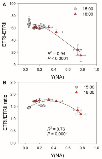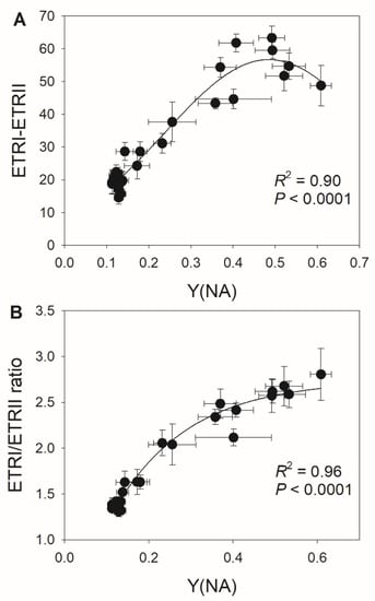 Relationships between (A) Y(NA) and ETRI–ETRII and between (B) Y(NA) and the ETRI/ERTII ratio during the high light phases under fluctuating light in tomato leaves. Data are shown as mean ± SE (n = 5).
