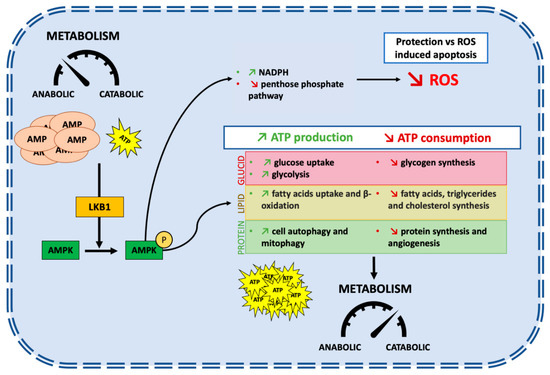 To sum up, STK11/LKB1 is an upstream kinase of the AMPK pathway, a major regulator of cell metabolism under stress conditions (Figure 1). STK11/LKB1 reschedules cell metabolism by restraining the activity of anabolic enzymes and by promoting the production of instantly available energy with ATP, thus slowing down cell growth and ATP-consuming processes. It also protects the genome from ROS-induced oxidation by regulating antioxidant gene products, and finally promotes cell survival under stress conditions.