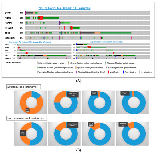 Figure 2. Frequency of most common genomic alterations in tumor suppressor genes among NSCLC patients, based on TCGA (A) and the literature (B) Panel (A) is adapted from https://www.cbioportal.org/ (accessed on 1 October 2021).