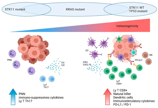 Figure 3. Schematic impact of KRAS, STK11, and TP53 status on immune cell tumor microenvironment in lung cancer. This figure was created with BioRender.com (accessed on 1 October 2021).