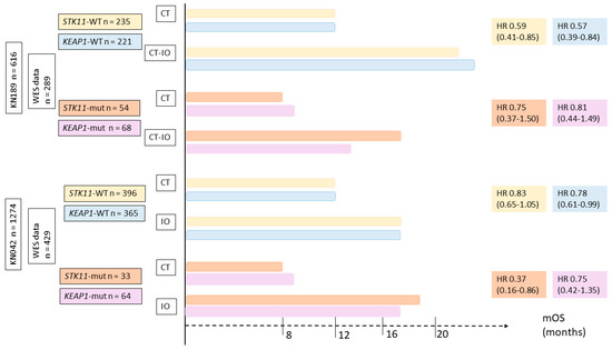 Figure 4. Impact of STK11 or KEAP1 status on immune resistance during first-line therapy based on two phase III trials, evaluated chemotherapy versus immunotherapy (KEYNOTE 042) or versus chemo-immunotherapy (KEYNOTE 189). CT = chemotherapy, IO = immunotherapy.