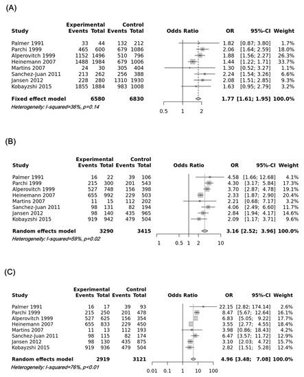 (A) Forest plot of the association between the M129V single-nucleotide polymorphism (SNP) of the PRNP gene and susceptibility to sporadic Creutzfeldt–Jakob disease (CJD) in the additive model (M vs. V). (B) The forest plot for the association between the M129V SNP of the PRNP gene and susceptibility to sporadic CJD in the recessive model (MM vs. MV + VV). (C) The forest plot for the association between the M129V SNP of the PRNP gene and susceptibility to sporadic CJD in the heterozygote comparison (MM vs. MV).