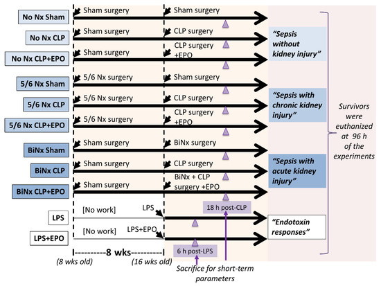 The experimental protocol was approved by the Animal Experimentation Ethics Committee of the Faculty of Medicine, Chulalongkorn University (Bangkok, Thailand, protocol number 018/2561) for animals, following the National Institutes of Health (NIH) criteria and in accordance with the ARRIVE guidelines and regulations for animals. Mice were purchased from Nomura Siam International (Pathumwan, Bangkok, Thailand), and 8-week-old male C57BL/6J mice were originally used in all experiments (Figure 1). Cecal ligation and puncture (CLP) and lipopolysaccharide (LPS; endotoxin) injection [17,18,19] were used to test the impact of EPO and the pre-existing renal injury was induced by bilateral nephrectomy (BiNx) and 5/6 nephrectomy (5/6 Nx) following previous protocols [20].