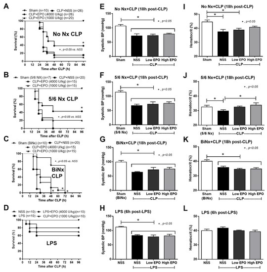 Erythropoietin (EPO) administration attenuates sepsis severity in sepsis mouse models. Characteristics of cecal ligation and puncture (CLP) mice without renal resection (no Nx CLP) or with 5/6 nephrectomy (5/6Nx) or bilateral nephrectomy (BiNx) and lipopolysaccharide (LPS) administered to mice after treatment with EPO or normal saline (NSS) as determined by survival analysis (A–D), systolic blood pressure (E–H) and hematocrit (I–L) are demonstrated (n = 7–10/group for (E–L)).