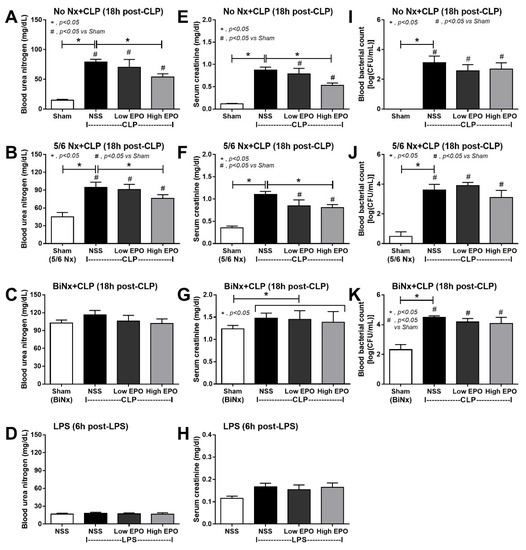 Briefly, CLP was performed under isoflurane anesthesia through abdominal incision with ligation at 1.5 cm from the cecal tip and punctured twice with a 21-gauge needle. An antibiotic, Primaxin (imipenem/cilastatin; Merck, Kenilworth, NJ, USA), at 10 mg/kg in 100 µL of normal saline (NSS) was subcutaneously administered after CLP and once daily thereafter for 3 days for the survival study. Recombinant human EPO (Recormon®®; Roche, Basel, Switzerland) at 1000 or 4000 U/kg was divided into 2 subcutaneous injection doses after CLP and at 6 h after CLP following a previous publication [21]. For the model of sepsis with 5/6Nx (5/6Nx CLP), a representative chronic kidney disease model, the 5/6Nx procedure started with resection of the upper and lower poles of the left kidney followed by right nephrectomy 5 days later through the abdominal incision at 8 weeks prior to the CLP surgery. The adequacy of kidney mass resection was inferred from a ratio of removed fragments of left kidney to right kidney of 0.55–0.72. For the model of sepsis with BiNx (BiNx CLP), BiNx with CLP operation through abdominal incision was performed at 8 weeks after sham surgery (Figure 1). Sham was the abdominal incision only to identify kidneys or cecum. After all of the surgical procedures, mice were monitored every 30 min for 2 h then every 1 h until 6 h post-surgery. In parallel, 10 mg/kg tramadol (Taj pharma, Mumbai, Maharashtra, India) in 100 µL of NSS was subcutaneously administered after the operation, at 6 h post-operation and once daily after that for 3 days post-surgery to attenuate the post-operative pain. The moribund mice with more than 15% weight loss, loss of mobility after a touch stimulation and labored respiration were recognized as the humane endpoints that were immediately sacrificed by cardiac puncture under isoflurane anesthesia. In parallel, the LPS injection model was performed in 16-week-old mice (Figure 1) by intraperitoneal administration of endotoxin (LPS) from Escherichia coli 026: B6 (Sigma-Aldrich, St. Louis, MO, USA) at 4 mg/kg. Systolic blood pressure (SBP) was measured by tail cuff plethysmography (IITC Life Scientific Instruments, Woodland Hills, CA, USA) as previously described [22]. The SBP data were an average of 3 measurements with a 10 min interval. Blood was collected through tail vein nicking at specific time points and through cardiac puncture at sacrifice. At sacrifice, several organs were collected and kept at −80 °C before use. For survival observation, the mice were observed twice a day for 96 h, starting at 12 h post-CLP by the trained staff of the animal faculty at the Faculty of Medicine, Chulalongkorn University. Then, mice were weighed daily and the mice with more than 15% loss of weight or in the moribund status, as indicated by labored respiration and non (or less) moving after touch stimulation, were counted as dead and immediately euthanized by cardiac puncture under isoflurane anesthesia. All surviving mice in CLP experiments were sacrificed at 96 h after CLP (or sham) surgery. For the short-term CLP sepsis parameters, all sepsis mice (CLP, 5/6 Nx CLP, BiNx CLP) with or without EPO treatment and sham were sacrificed at 18 h post second surgery (at 16 wks old) (Figure 1). In the LPS injection model, the mice were observed every 15 min for 3 h then every 1 h until 12 h post-LPS. After that, the mice were observed twice daily, starting at 18 h post-injection and the moribund mice (as previously described) were immediately euthanized by cardiac puncture under isoflurane anesthesia. All surviving mice in LPS experiments were sacrificed by cardiac puncture under isoflurane anesthesia at 96 h after injection. For the short-term parameters of LPS sepsis, the mice with LPS or NSS with or without EPO treatment were sacrificed at 6 h post injection (at 16 wks old) (Figure 1). Notably, all mice in both CLP and LPS experiments were sacrificed following these criteria without the mice that were found dead during the observation.