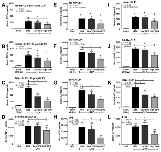 Erythropoietin (EPO) administration attenuates serum cytokines in sepsis mouse models. Serum TNF-α (A–D), IL-6 (E–H) and IL-10 (I–L) in cecal ligation and puncture (CLP) mice without renal resection (no Nx CLP) or with 5/6 nephrectomy (5/6Nx) or bilateral nephrectomy (BiNx) and lipopolysaccharide (LPS) administered to mice after treatment with EPO or normal saline (NSS) (A–D) are demonstrated (n = 7–10/group).