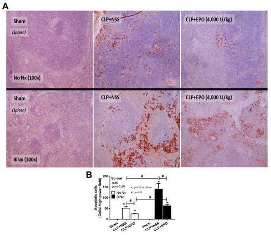 Interestingly, while high-dose EPO attenuated serum cytokines in all sepsis models (Figure 5), low-dose EPO reduced only serum TNF-α and IL-10 in BiNx-CLP mice (Figure 5C and Figure 2A). Among CLP mice, the mice without pre-existing renal injury (No Nx) demonstrated the least severity, while BiNx CLP mice showed the highest severity as determined by serum cytokines (Figure 5A–K). However, spleen apoptosis of EPO-treated CLP in No Nx mice and BiNx mice was evaluated and EPO attenuated spleen apoptosis in both models, regardless of the different in the severity of sepsis (Figure 6A,B).