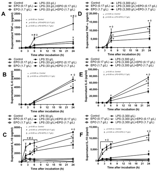 Erythropoietin (EPO) attenuates supernatant cytokines in lipopolysaccharide (LPS)-activated macrophages. Time courses of supernatant cytokines from macrophages with 6 h of control culture media (control), EPO alone (EPO), LPS alone (LPS) or EPO with LPS (LPS + EPO), at low concentration (33 g/L) (A–C) and high concentration (3300 g/L) (D–F) are demonstrated (independent triplicate experiments were performed).