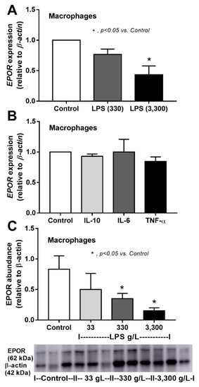 Lipopolysaccharide (LPS) downregulates the expression of the erythropoietin receptor (EPOR) gene and reduces EPOR abundance in macrophages. Expression of erythropoietin receptor (EPOR) in macrophages 6 h after culture media (control), LPS at 330 g/L or LPS at 3300 g/L (A) or 6 h after activation of different cytokines (B) is demonstrated (independent triplicate experiments were performed). In addition, the protein abundance of EPOR in macrophages with 6 h of stimulation by control media or LPS is shown in arbitrary units and representative Western blot analysis (C) (independent triplicate experiments were performed).