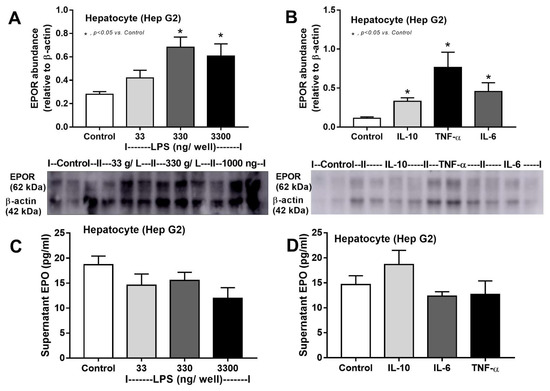 Lipopolysaccharide (LPS) and inflammatory cytokines increase the abundance of erythropoietin receptor (EPOR) in hepatocytes. Protein abundances of EPOR in hepatocytes (HepG2 cell line) 24 h after treatment with culture media (control), LPS at 33–3300 g/L (A) or 24 h after activation of different cytokines (B) are demonstrated with representative Western blot analysis (independent triplicate experiments were performed). In addition, supernatant erythropoietin (EPO) from hepatocytes after these stimulations (C,D) is shown (independent triplicate experiments were performed).