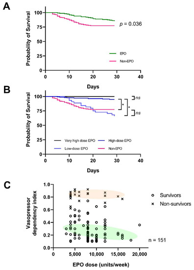 Clinical outcomes of the study. Relationship between erythropoietin (EPO) dose and the vasopressor dependency index (VDI) of patients who received EPO stratified by survivors (n = 129) vs. non-survivors (n = 22), where the green and red shades represent the trends of each group, respectively, formulated by nonlinear fit (A) and Kaplan–Meier analysis of mortality through day 29 (B) are demonstrated. Data were censored for 129 patients in the EPO group (85.4%) and 149 in the non-EPO group (77.2%). (C) The relationship between EPO doses and VDI was also demonstrated—the higher the EPO doses, the lower the VDI. *, p < 0.0001.
