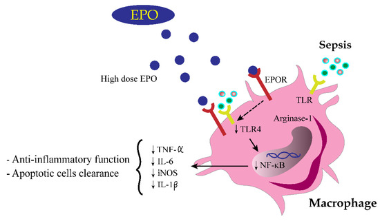 Sepsis, in all tested mouse models, enhanced the endogenous serum EPO. The necessity of a high dose of EPO for its anti-inflammatory effect in sepsis might be due to the reduced EPOR in macrophages.