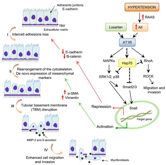 We investigated the role of Hsp70 through losartan effect on angiotensin II induced epithelial–mesenchymal transition in primary culture of PTECs from a genetic experimental model of hypertension (SHR). We demonstrate that Hsp70 within the losartan effect inhibits the EMT induced by angiotensin II in PTECs from SHR. Losartan increased E-cadherin levels and decreased vinculin, α-SMA, vimentin, pERK, p38 and Smad2–3 activation compared to angiotensin II treated and without treatment SHR PTECs. Moreover, losartan inhibited matrix metalloproteinase-2 and 9 secretion, reduced migration and cellular displacement, stabilizing intercellular junctions. Notably, losartan treatment in shHsp72 knockdown SHR PTCs showed results similar to SHR PTECs that lead to the EMT process. Losartan treatment in SHR PTECs induced decrease in Rac1 and RhoA activation. Although, in shHsp72 Knockdown SHR PTECs no significant changes were observed [].