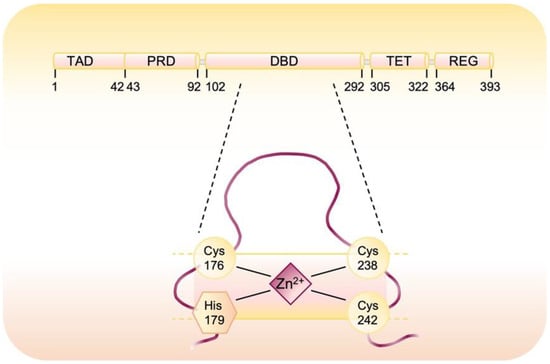 Domain structure of p53. Human p53 is composed of 393 amino acid residues and has an N-terminal transactivation domain (TAD), proline-rich domain (PRD), DNA-binding domain (DBD), tetramerization domain (TET), C-terminal regulatory domain (REG). The magnification shows the residues involved in the coordination of a zinc ion.