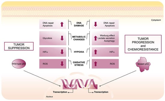 Several types of stress cause ROS accumulation and p53 protects the oxidation of the genome by ROS that are the major cause of genetic instability [25,26]. The regulation of oxidative stress by p53 is complex, exerting both pro-oxidative and anti-oxidative effects [27]. The result of p53 activation is dependent on severity and duration of the stress [26]. Under severe stress conditions, p53 induces cell death or cell cycle arrest [28]. There are several p53-inducible proteins that are activated during apoptotic responses and promote ROS generation such as p53-induced gene 3 (PIG3) [28], BAX, PUMA to support pro-apoptotic activity of p53 in response to severe stress [29]. Furthermore, to enhance this effect, p53 can also modulate the expression of genes such as superoxide dismutase 2 (SOD2) [30] and glutathione peroxidase 1 (GPX1) [31] inhibiting them from increasing oxidative stress and support the pro-apoptotic activity of p53 [28]. On the contrary, under low-stress conditions p53 does not induce cell death and suppresses ROS production [32]. Regarding antioxidant roles, wild-type p53 regulates several signaling pathways to exert antioxidant activities [24]. For instance, some studies reported that wild-type p53 suppresses the expression of NOX4, a catalytic subunit of the NADPH oxidase complex that catalyzes the molecular oxygen reduction to different types of ROS, inhibiting ROS production [33]. Another important p53-activated antioxidant genes include the enzymes specifically involved in ROS degradation such as GPX1 [34] or catalase [35]. Sestrins are p53-target genes involved in antioxidant response and their inactivation by p53 mutation or other mechanisms has a critical role in carcinogenesis [36]. Furthermore, p53 can exert its anti-oxidant roles preventing the inflammatory events through the inhibition of the NF-κB activity, that is a transcription factor and crucial regulator of the expression of chemokines [37]. P53 can also inhibit ROS production by metabolic changes as the activation of p53-induced glycolysis and apoptotic regulator TIGAR that inhibit glycolysis and decrease ROS levels [19]. The importance of p53 induced antioxidant function is supported in p53-deficient cells that result in excessive oxidation of DNA and increased mutation rate [32]. Intriguingly, these wild-type p53-induced responses are in line with its tumor suppressor role, while its p53 mutant counterpart generally exerts an opposite response to sustain its oncogenic role in cancers, such as the pro-oxidant effect or reprogramming of energy metabolism and chemoresistance, which are briefly discussed in the following sections.