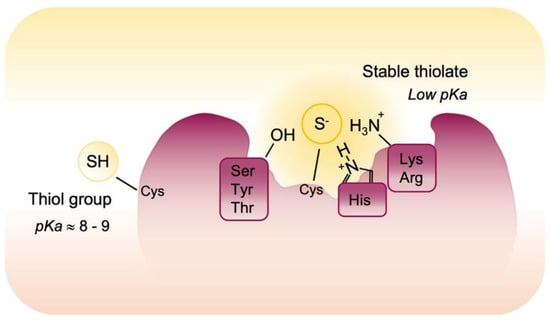 Reactivity of cysteines. The pKa value of most of proteins Cys residues have a pKa value higher than 8 but some redox sensitive cysteine residues are localized in specific protein environment that contributes to decrease their pKa. Specifically, neighboring amino acids stabilized protein thiolates via hydrogen bonds and electrostatic effects and render them sensitive to oxidative post-translational modifications.