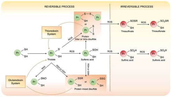 Under strong oxidative conditions, protein thiols evolve in the formation of irreversible post-translational modifications. These PTMs are associated with protein misfolding and aggregation. These covalent aggregates are not reduced back even when the redox conditions are restored so that these irreversible PTMs are associated with oxidative damages. A summary of the various oxidative post-translational modifications of Cys associated with their formation is presented in Figure 4.