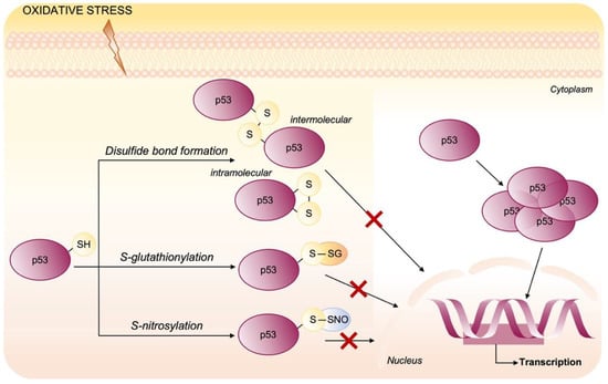 Oxidative post-translational modifications of p53. In p53, the reduced cysteine residues located in the DNA-binding domain are important to maintain the p53 tetrameric structure. p53 activity is known to be affected by several post-translational modifications induced by oxidative stress that impair the DNA binding. Cysteine residues can be easily oxidized, and their oxidation is mostly reversible resulting in intermolecular/intramolecular disulfide bond formation, S-glutathionylation and nitrosylation.