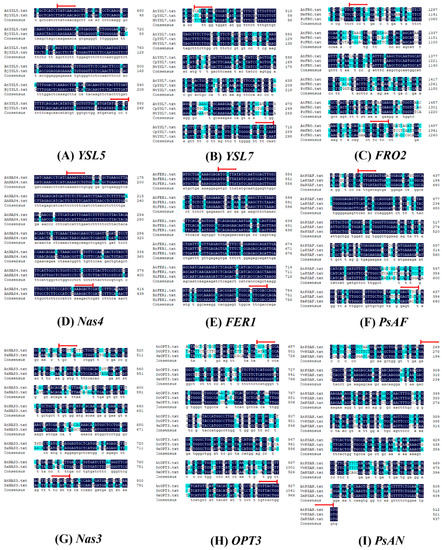 DNA sequence alignment diagrams for AtYSL5 and BjYSL5 (A); AtYSL7, CpYSL7, and NtYSL7 (B); AtFOR2, MeFRO2, and PcFRO2 (C); AtNAS4 and AhNAS4 (D); AtFER1, BrFER1, and HiFER1 (E); AtPsAF, LaPsAF, and NtPsAF (F); AtNAS3 and SaNAS3 (G); AtOPT3, DcOPT3, and NtOPT3 (H); AtPsAN, VvPsAN, and ZmPsAN (I). The alignment was obtained by using the DNAMAN software.