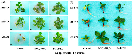 Photographs showing the morphology of H. macrophylla as affected by the Fe source and medium pH after 60 days of culture: (A) a top view of the plantlets, still in the medium; and (B) representative individual plantlets. The bars in each photograph indicate 1 cm.