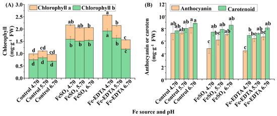 The chlorophyll contents significantly changed in response to various Fe sources and pHs (Figure 3A), and the lowest chlorophyll a and b contents were found in the control group regardless of the pH. Similarly, the treatments with FeSO4 had little change among the different pHs, whereas, in the treatments with Fe-EDTA, the contents of chlorophyll a and b decreased with the increase of pH. Conversely, for the anthocyanin content, the lowest was observed in the treatments supplemented with FeSO4 and Fe-EDTA at pH 4.70, followed by the treatments supplemented with the same Fe sources at pH 5.70. However, there were same carotenoid content among Fe source treatments (Figure 3B).